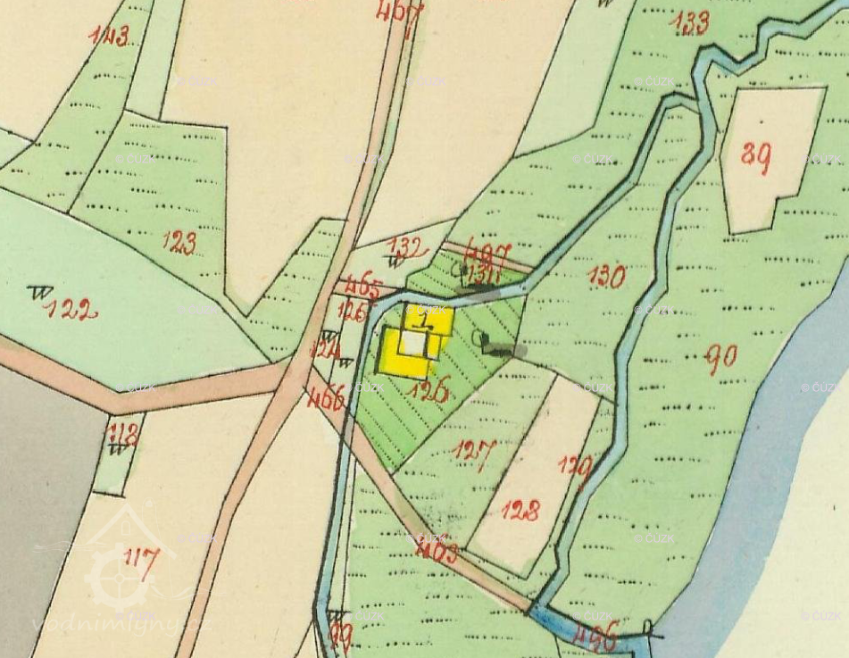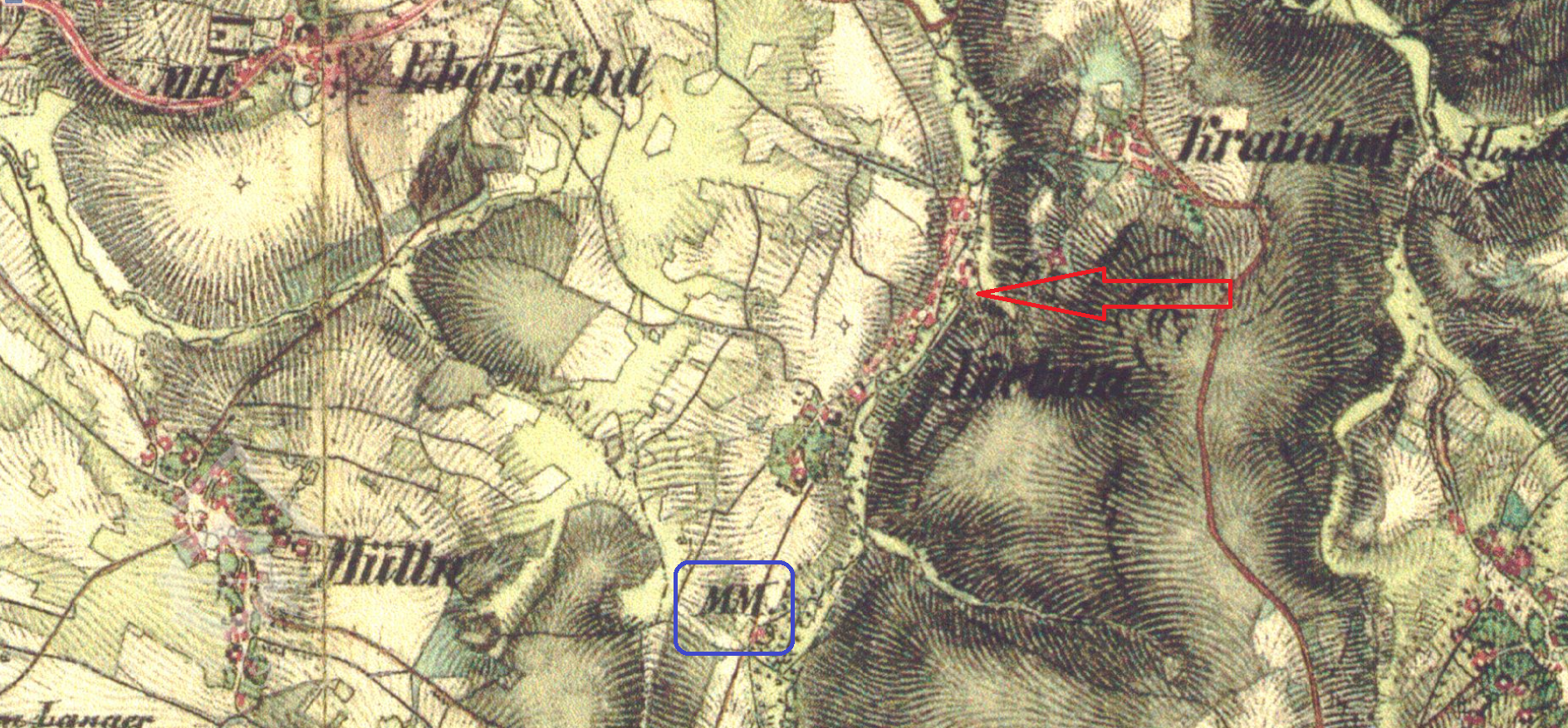 Mlýn v Libavě (červeně) a Libavský mlýn (modře), III. vojenské mapování, výřez, 1841, © oldmaps.geolab.cz