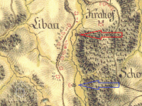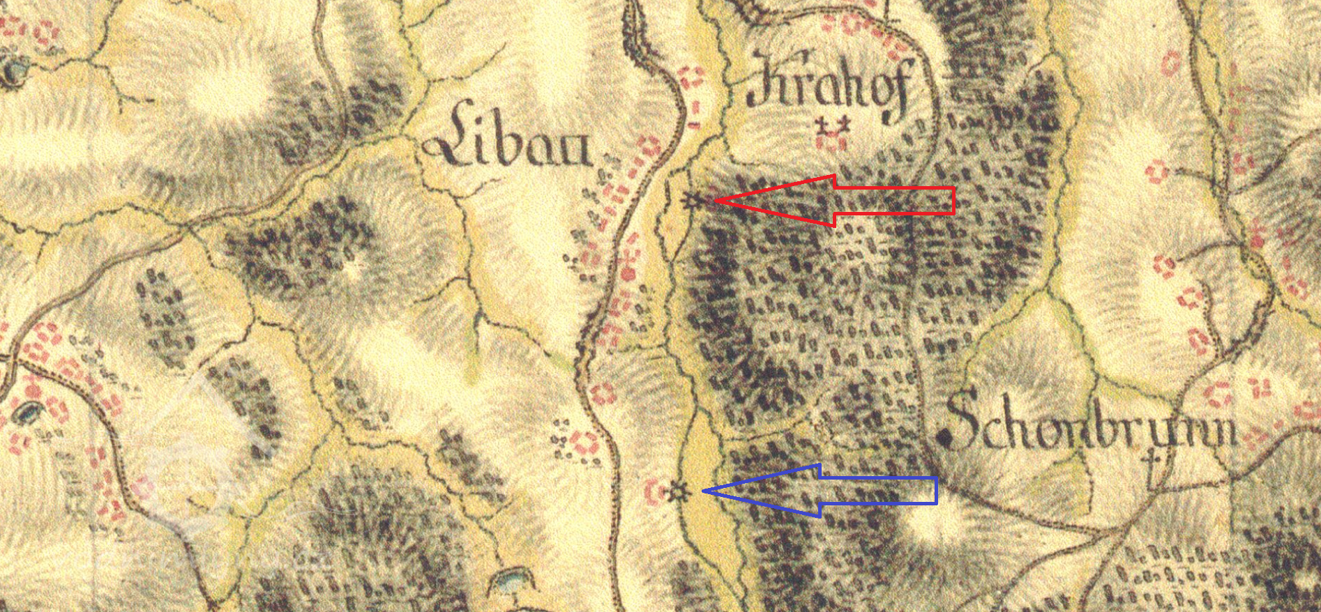 I. vojenské mapování (červeně), výřez, 1764-68, © viz oldmaps.geolab.cz
