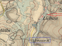 Mlýn v Libavě (červeně) a Libavský mlýn (modře), II. vojenské mapování, výřez, 1836-1852, © oldmaps.geolab.cz