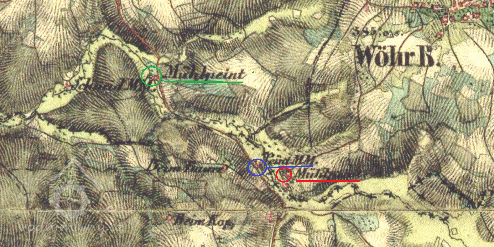 Horní I. (červeně), Horní II. (modře) a Dolní (zeleně) Peintmühle, II. vojenské mapování, výřez, 1836-1852, © oldmaps.geolab.cz