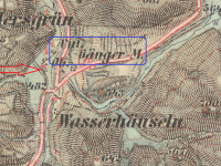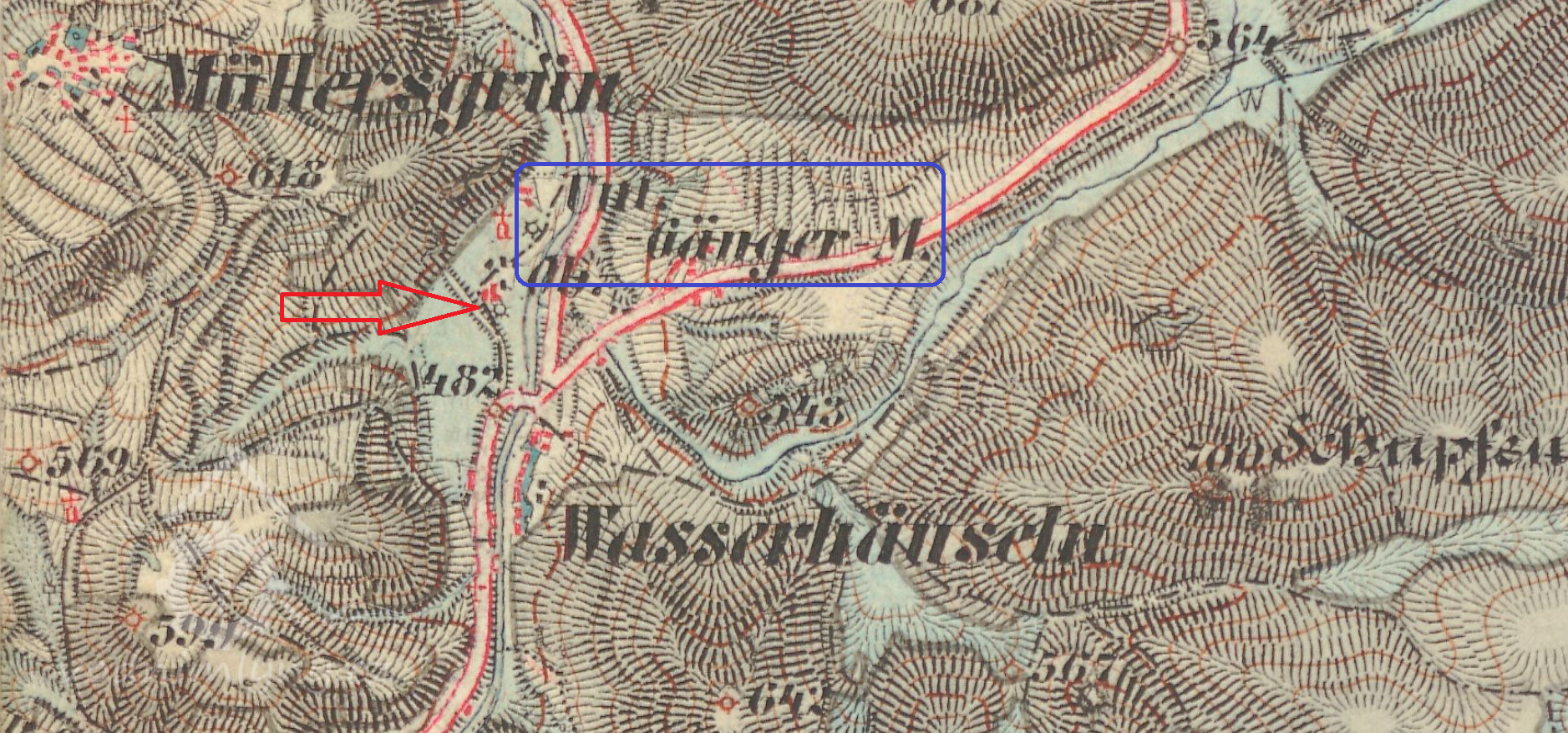 Horní (červeně) a Dolní (modře) Gängrův mlýn, III. vojenské mapování, výřez, 1877-1880, © oldmaps.geolab.cz