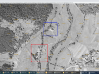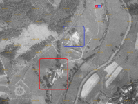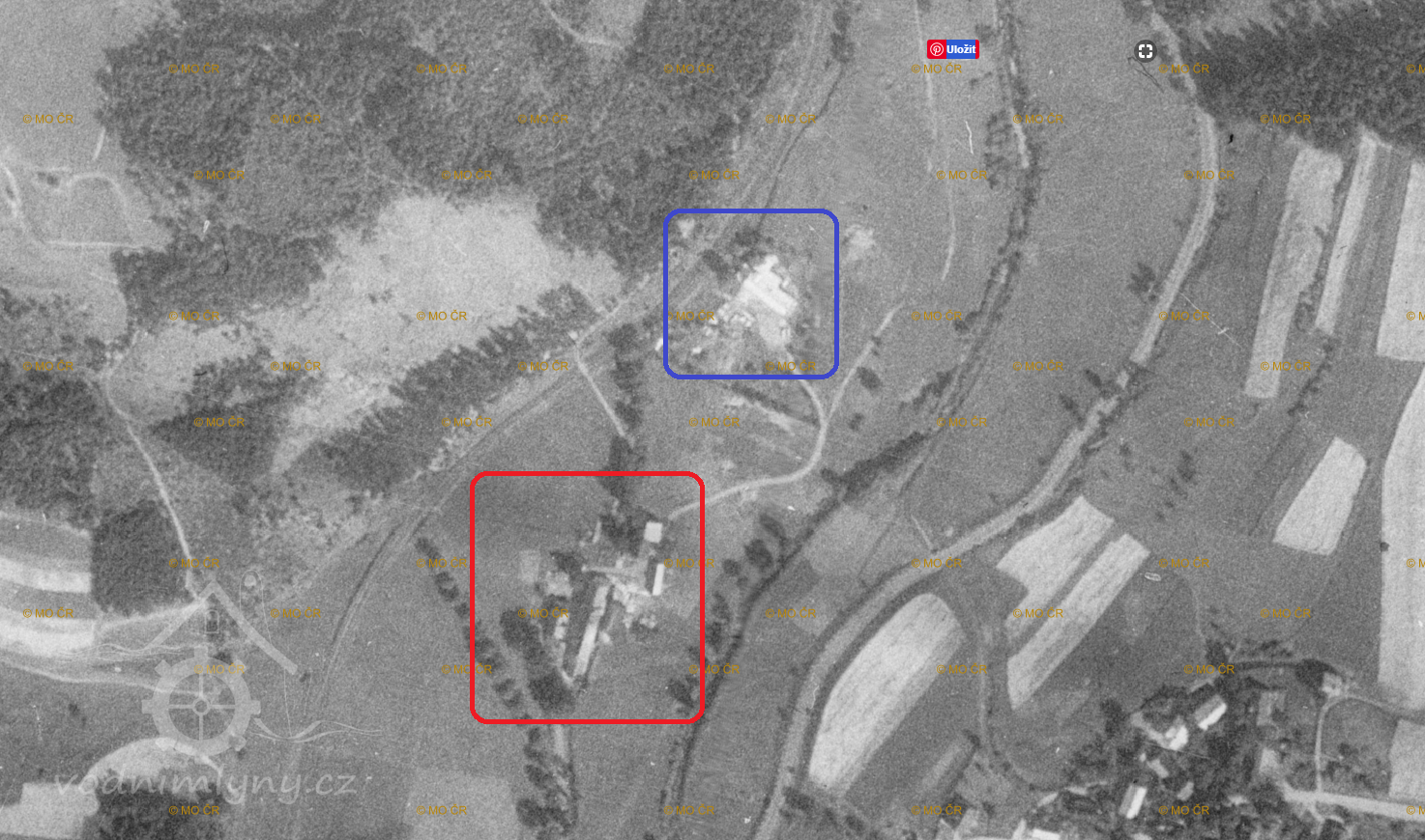 Horní (červeně) a Dolní (modře) Gängrův mlýn, letecký měřický snímek, výřez, 1938, © lms.cuzk.cz