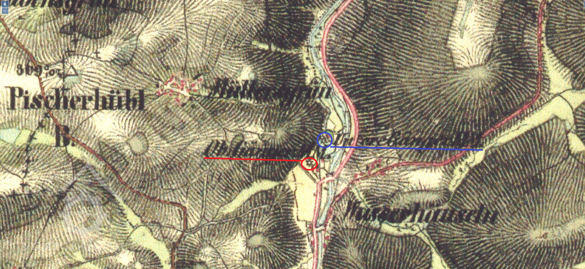 Horní (červeně) a Dolní (modře) Gängrův mlýn, II. vojenské mapování, výřez, 1836-1852, © oldmaps.geolab.cz