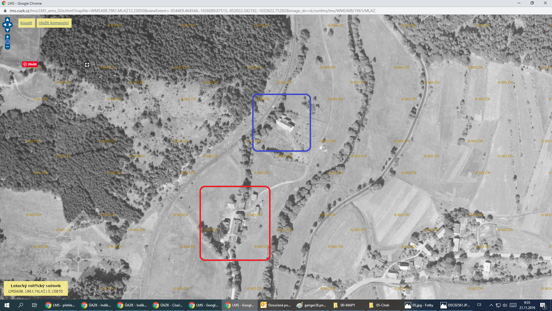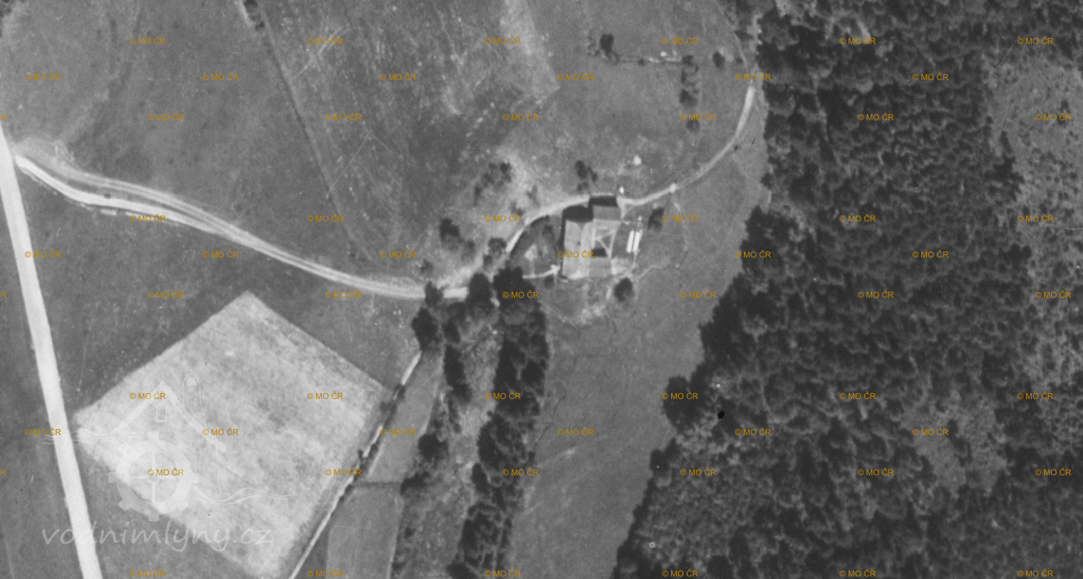 Horní (červeně) a Dolní (modře) Gängrův mlýn, letecký měřický snímek, výřez, 1961, © lms.cuzk.cz