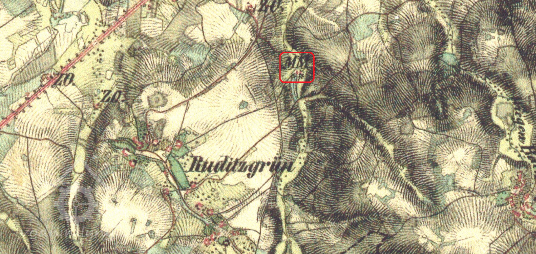 Horní (červeně) a Dolní (modře) Gängrův mlýn, II. vojenské mapování, výřez, 1877-1880, © oldmaps.geolab.cz
