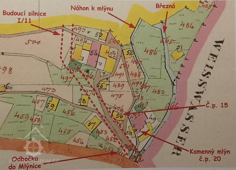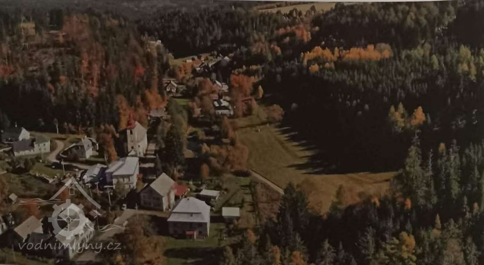Mlýn stával v pravé části snímku, mezi současným č.p. 7 a řekou Březnou. Náhon vedl přibližně v místě vzdálenějšího sloupu elektrického vedení., 2017, © Václav Jetmar