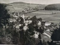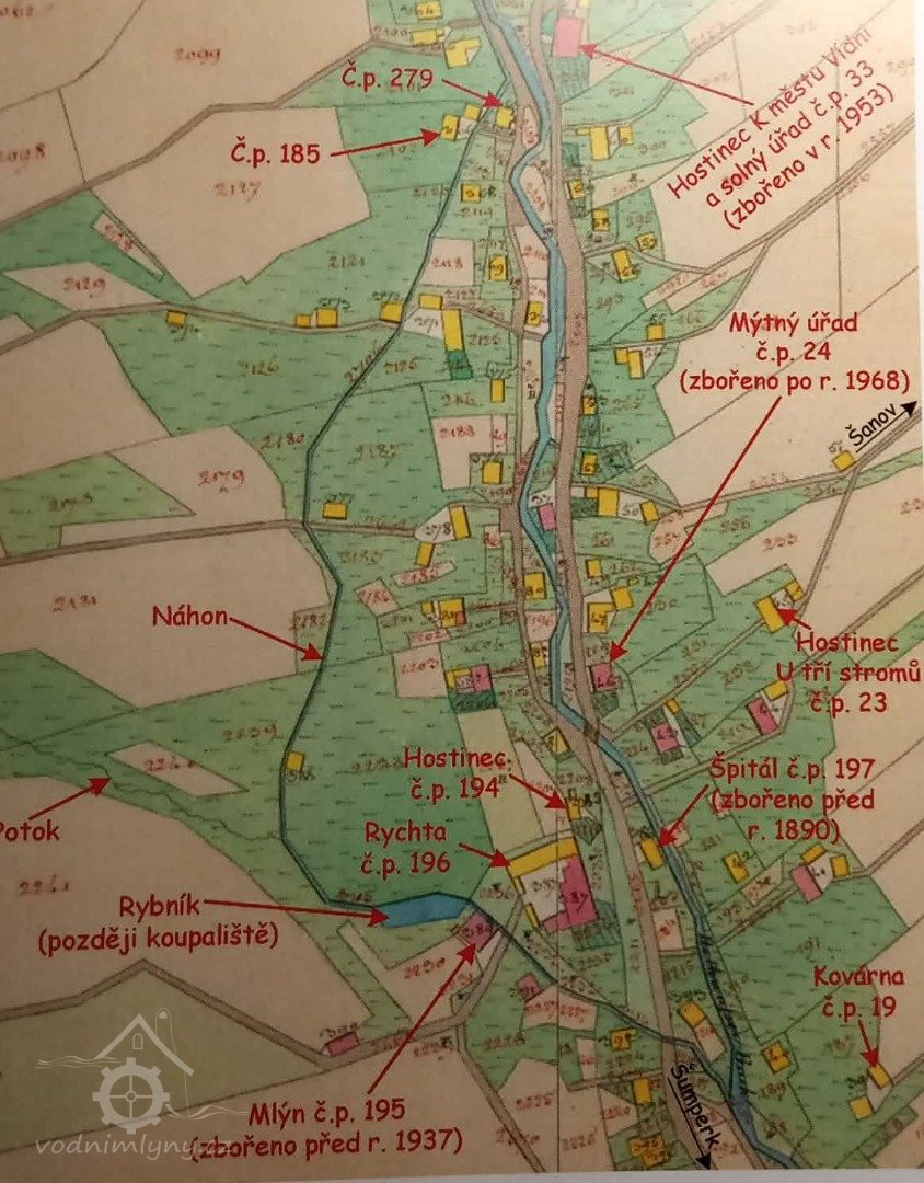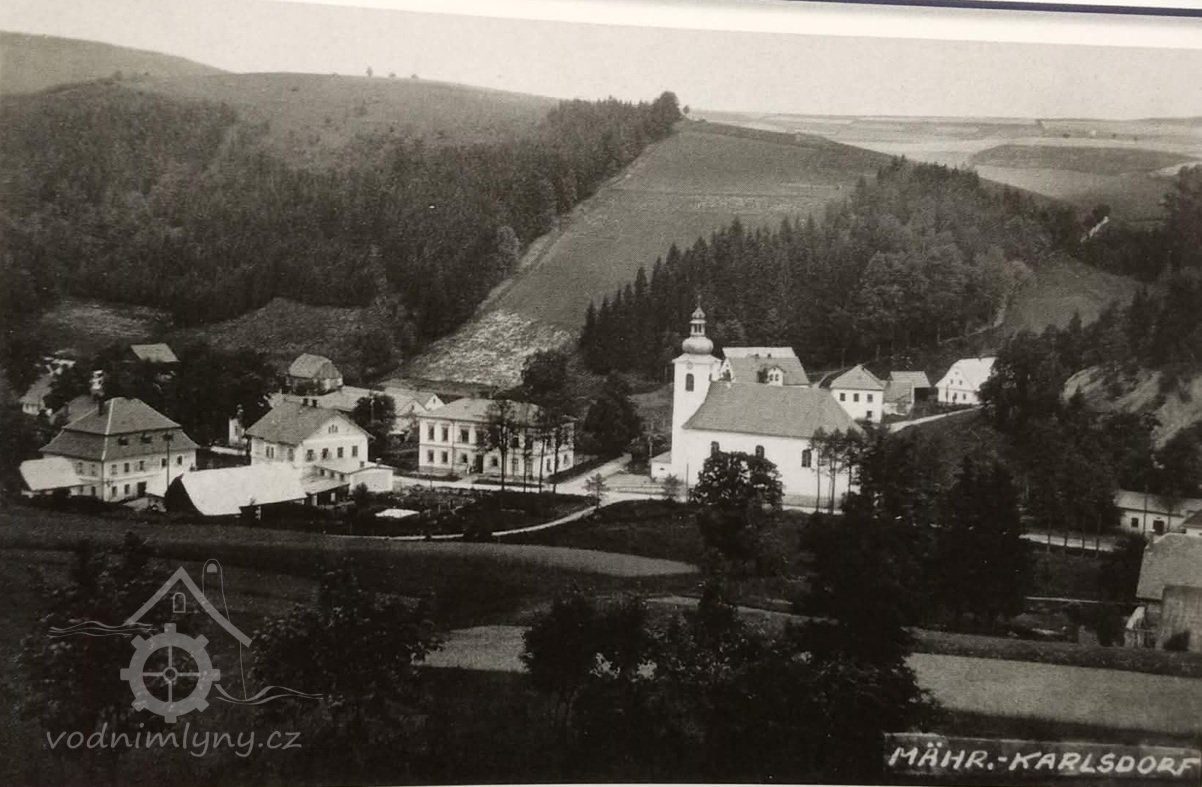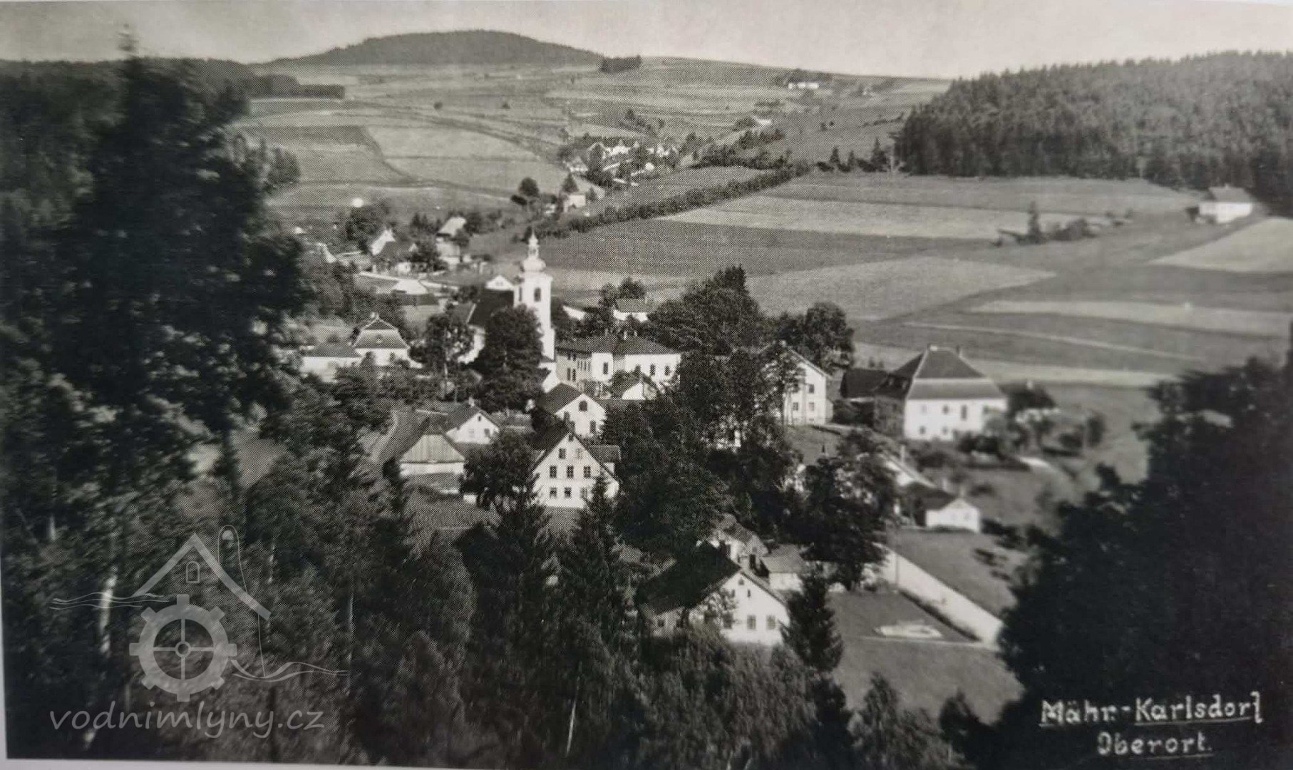 Pohlednice - střed obce s mlýnem., 1938, © J. Walter