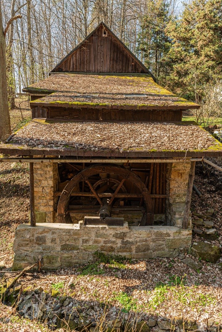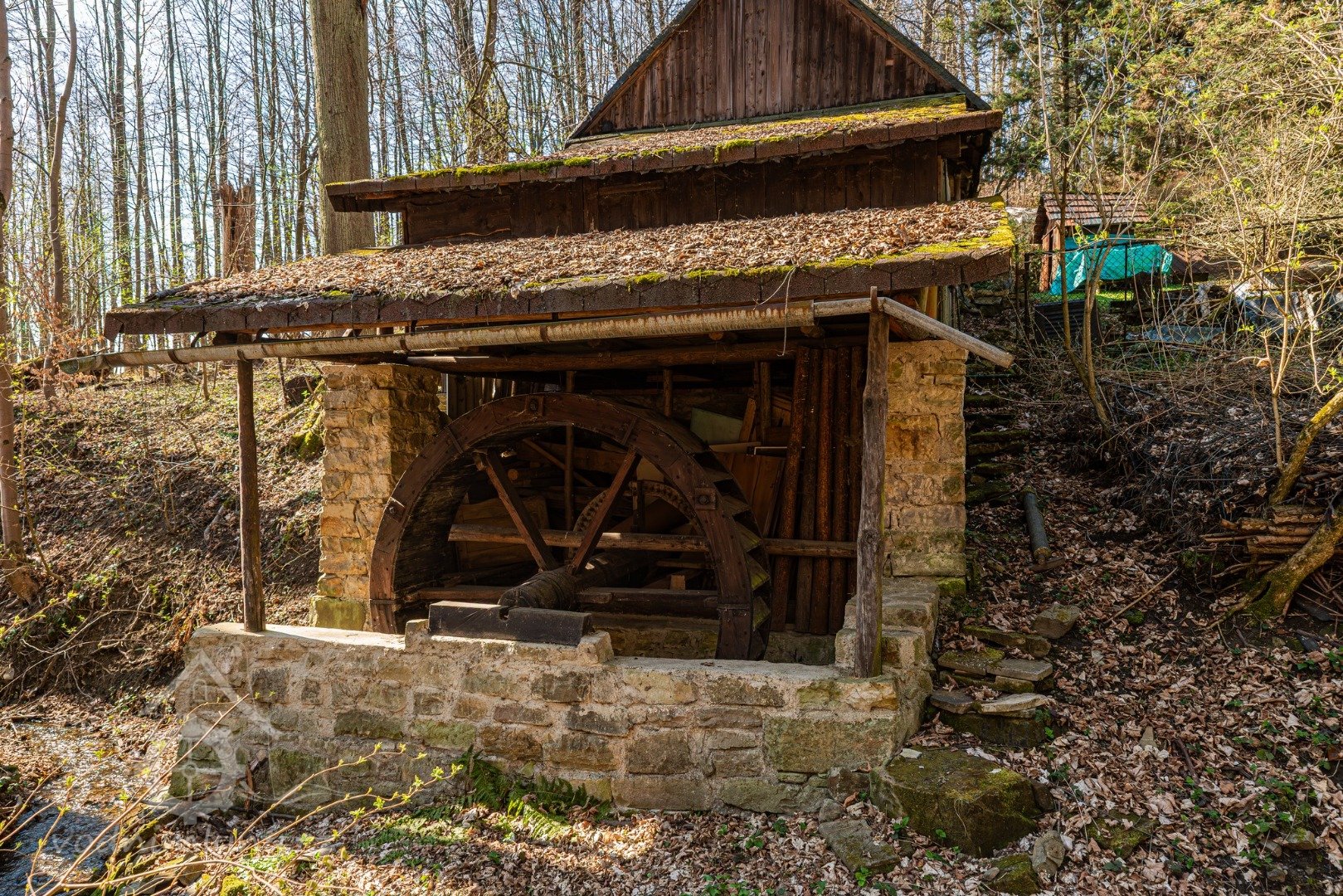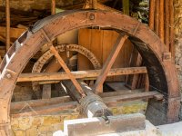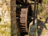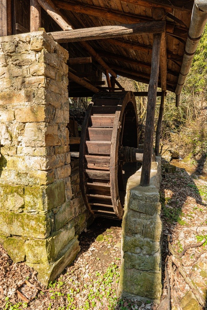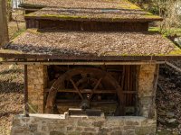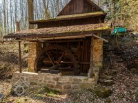 Vodní kolo, 04 2026, © Honza Hanys Hanys, (Prvky na obrázku: Vodní kolo, transmise, řemenice, převody - paleční kola, pastorky a cévníky (řemeslný výrobek))
