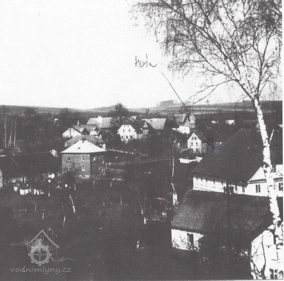 Pohlednice-vlevo již bývalý mlýn, pohled od západu,, nedatováno, © autor neznámý
