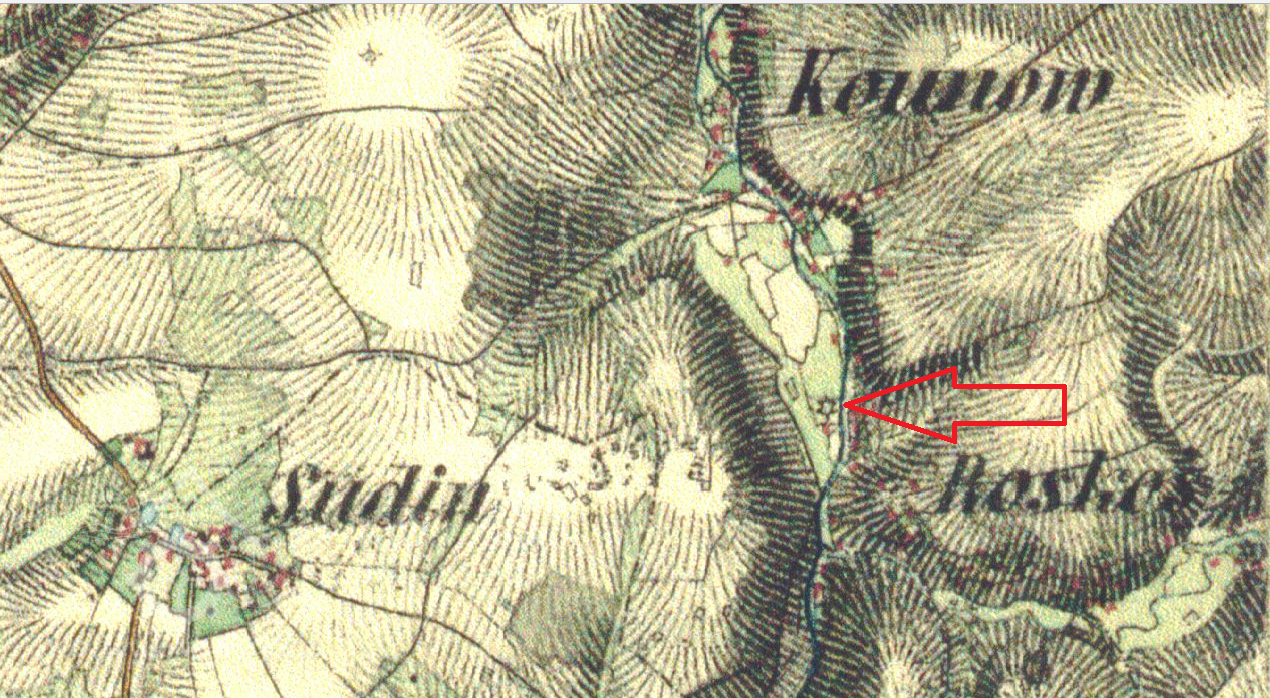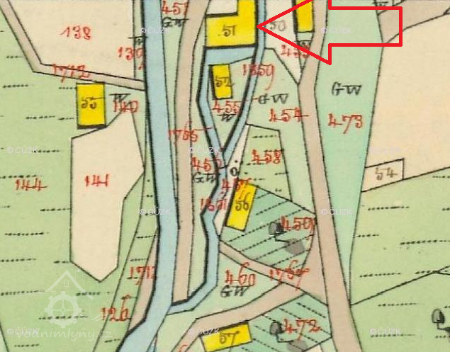 V tomto místě stával Hořejší mlýn v Uhlířských Janovicích čp.135, přestavěn na obytný dům čp.135, 1953, © kontaminace.cenia.cz