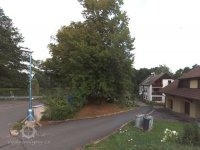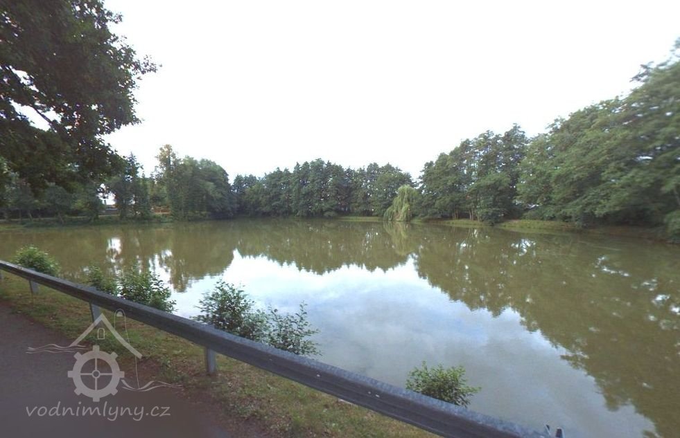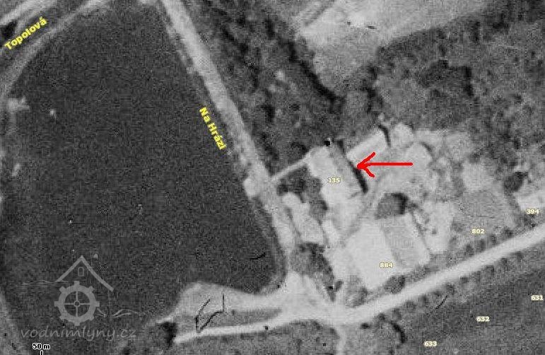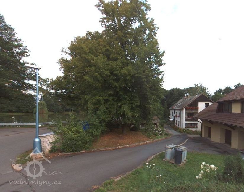 Zde stával Hořejší mlýn, přestavěn na bílý dům v pozadí čp. 135. Vlevo hráz a rybník., 2012, © mapy.cz